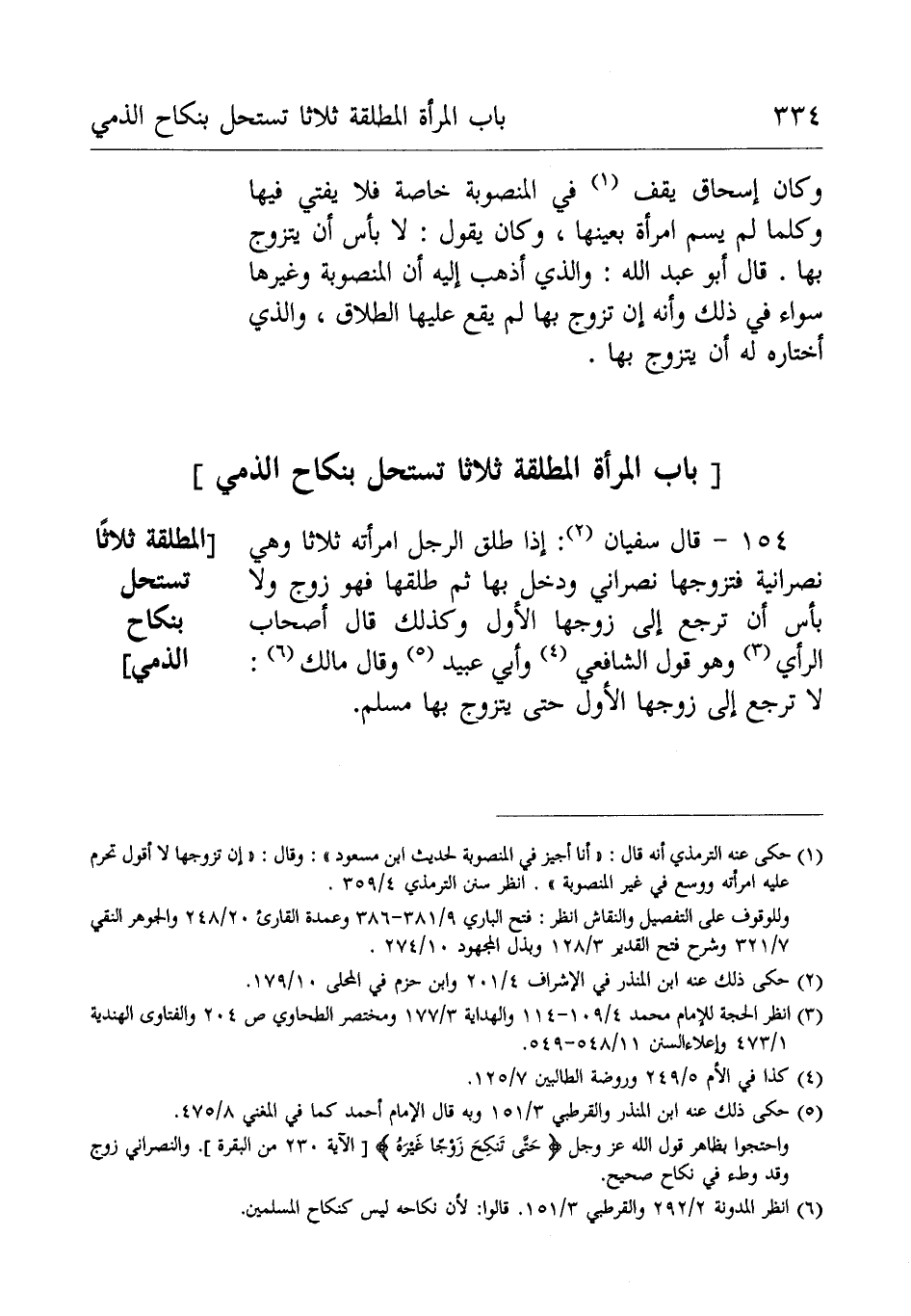 154- قَالَ سُفْيَانُ: إِذَا طلق الرَّجُل امرأته وهي نصرانية فتزوجها نصراني ودخل بِهَا ثُمَّ طلقها فَهُوَ زوج فلَا بَأْسَ أن ترجع إِلَى زوجها الْأَوَّل وكذَلِكَ قَالَ أَصْحَابُ الرَّأْيِ.