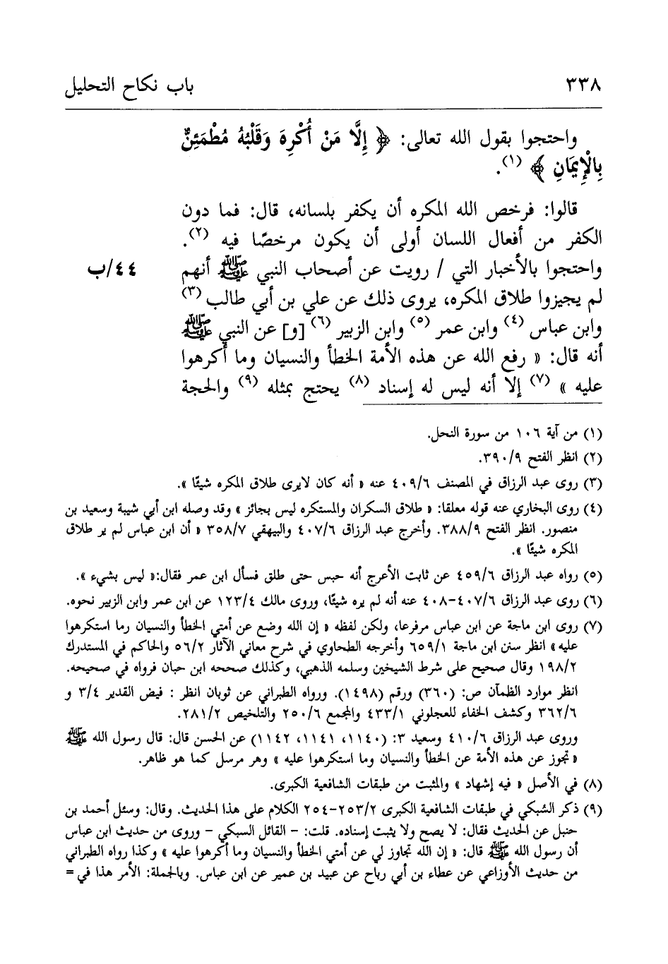 قَالُوْا: فرخص الله للمكره أن يفكر بلسانه قَالَ: فيما دون الكفر من أفعال اللسان أولى أن يكون مرخصا فيه واحتجوا بالأخبار التي [44/ب] رويت أن أَصْحَاب النَّبِيّ صَلَّى اللهُ عَلَيْهِ وَسَلَّمَ أَنَّهُم لم يجيزوا طلاق المكره يروى ذَلِكَ عَن علي بْن أبي طالب وابن عَبَّاس وابن عُمَر وابن الزبير عَن النَّبِيّ صَلَّى اللهُ عَلَيْهِ وَسَلَّمَ أَنَّهُ قَالَ: رفع الله عَن هَذِهِ الأمة الخطأ والنسيان وما أكرهوا عَلَيْهِ إِلَّا أَنَّهُ لَيْسَ له إسناد