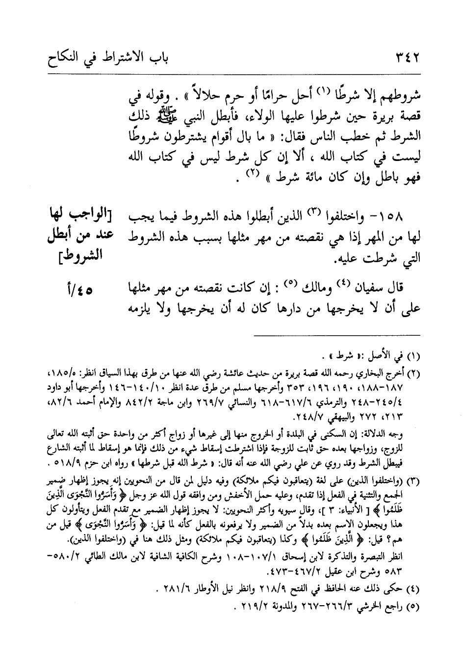 وقوله فِي قصة بريرة حين شرطوا عليها الولاء فأبطل النَّبِيّ صَلَّى اللهُ عَلَيْهِ وَسَلَّمَ الشرط ثُمَّ خطب الناس فقال: ما بال أقوام يشترطون شروطا لَيْسَ من كتاب الله ألا إن كُلّ شرط لَيْسَ فِي كتاب الله فَهُوَ باطل وإن كَانَ مائة شرط".
