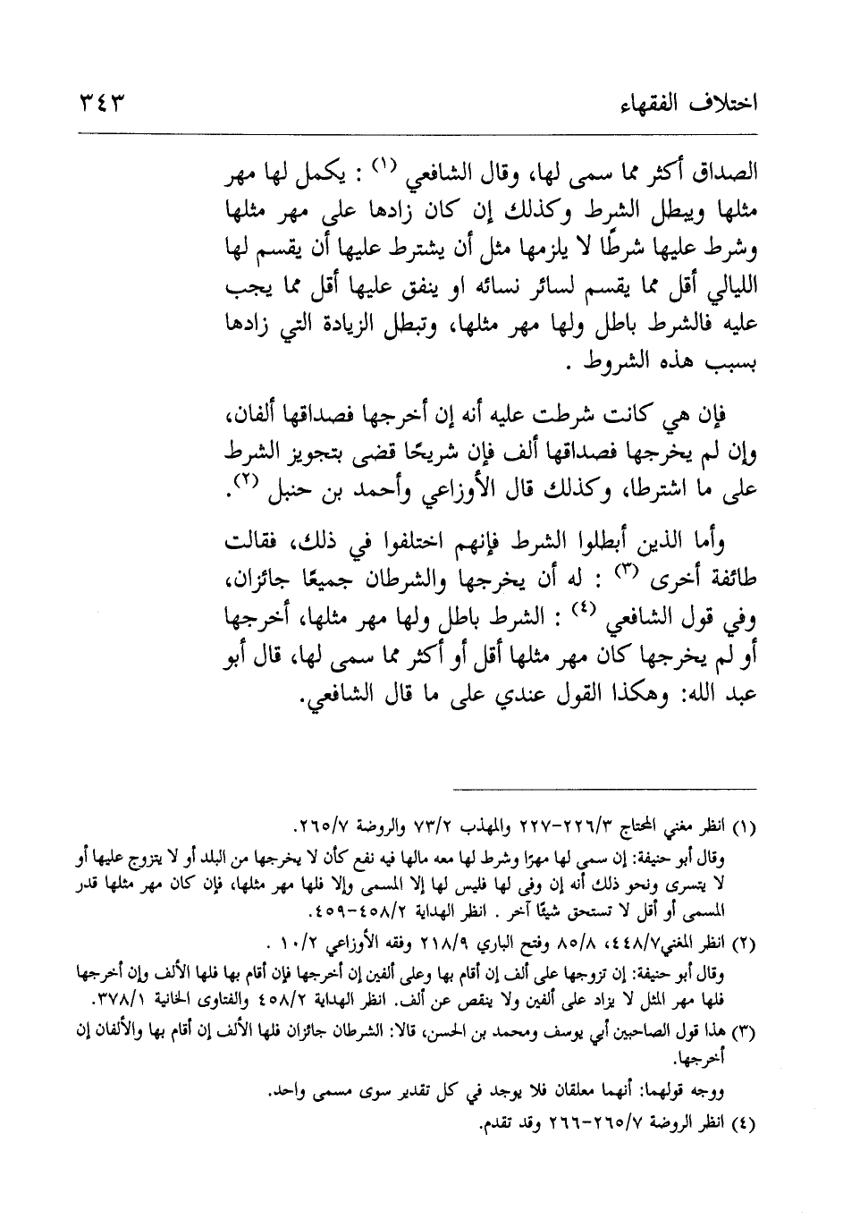 وَقَالَ الشَّافِعِيُُّ: يكمل لها مهر مثلها ويبطل الشرط مثل أن يشترط عليها أن يقسم لها الليالي أقل مما يقسم لسائرها أَوْ ينفق عليها أقل مما يجب عَلَيْهِ فالشرط باطل ولها مهر مثلها وتبطل الزيادة التي زادها بسبب هَذِهِ الشروط.