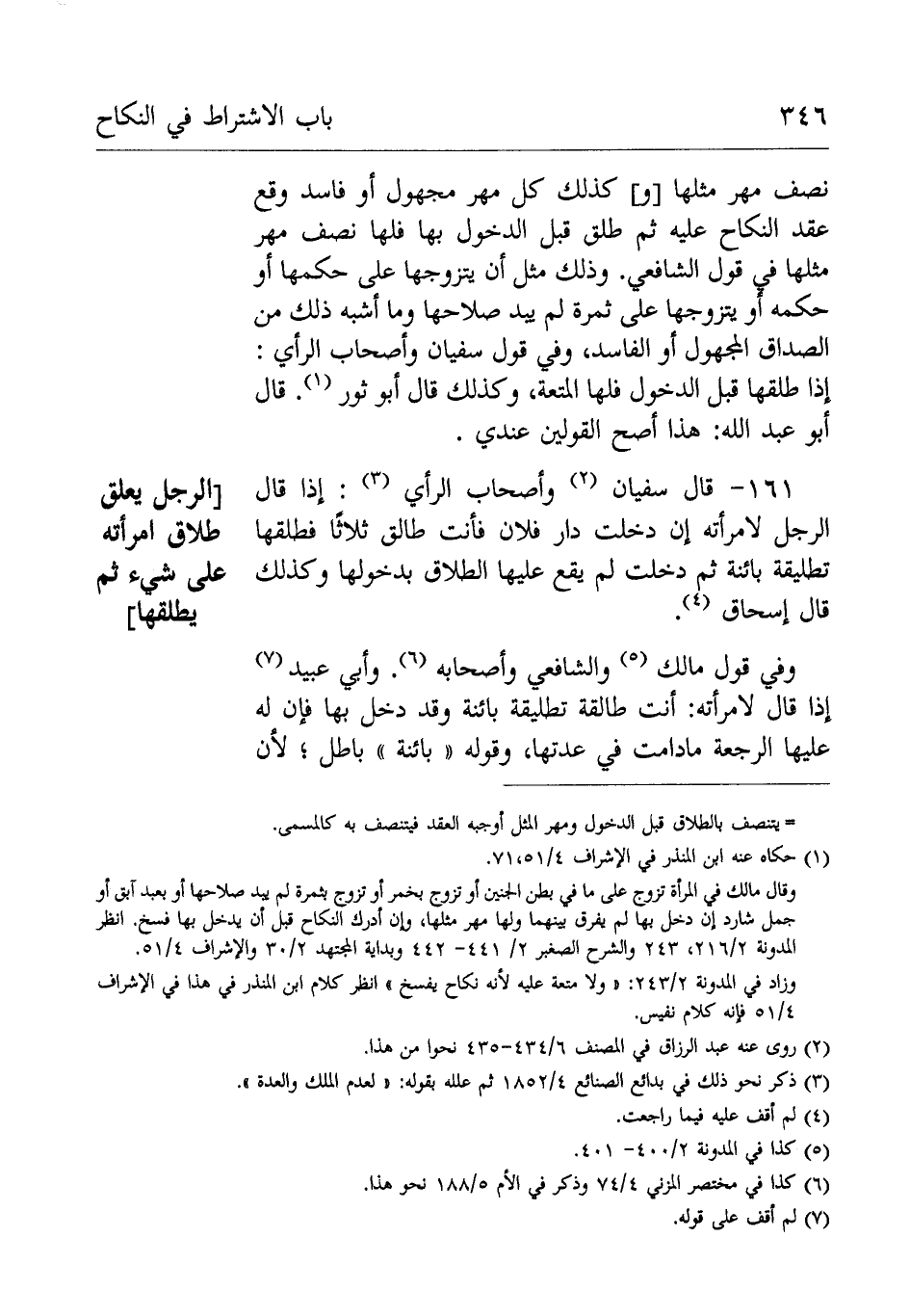 161- قَالَ سُفْيَانُ وأَصْحَاب الرَّأْيِ: إِذَا قَالَ: الرَّجُل لامرأته إن دخلت دار فلان فأنت طالق ثلاثا فطلقها تطليقة بائنة ثُمَّ دخلت لم يقع عليها الطلاق بدخولها.