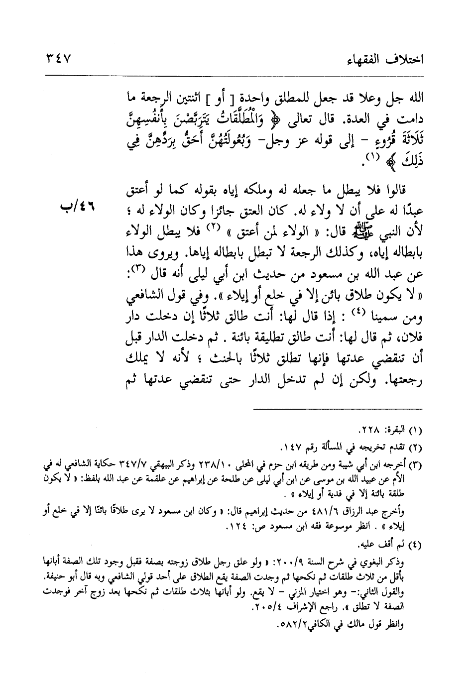 إِلَى قوله عز وجل: {وَبُعُولَتُهُنَّ أَحَقُّ بِرَدِّهِنَّ فِي ذَلِكَ [البقرة: 228} قَالُوْا: فلا يبطل ما جعله له وملكه إياه بقوله كما لو أعتق عبدا له عَلَى أن لَا دلالة كَانَ العتق جائزا وكَانَ الولاء له لِأَنَّ النَّبِيّ صَلَّى اللهُ عَلَيْهِ وَسَلَّمَ قَالَ: الولاء لمن أعتق" فلا يبطل الولاء بإبطاله إياه.