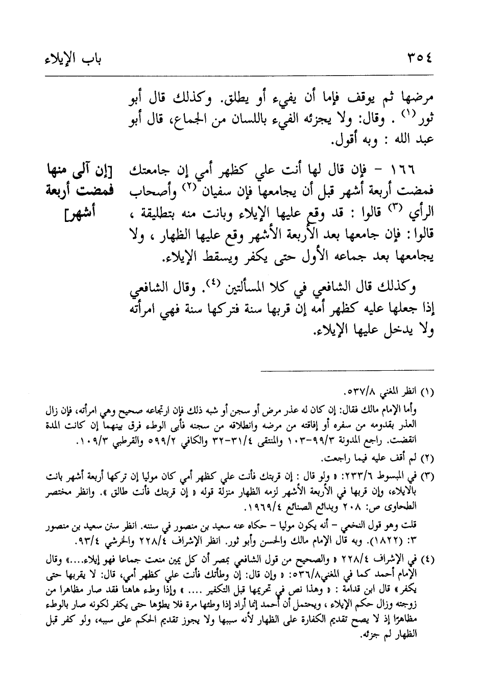 أن يجامعها فإن سُفْيَان وأَصْحَاب الرَّأْيِ قَالُوْا: قد وقع عليها الإيلاء وبانت منه بتطليقة قَالُوْا: فإن جامعها بَعْد الأربعة الأشهر وقع عليها الظِّهَار ولا يجامعها بَعْد جماعه الْأَوَّل حَتَّى يكفر وسقط الإيلاء وكذَلِكَ قَالَ الشَّافِعِيُّ فِي كلا المسألتين.