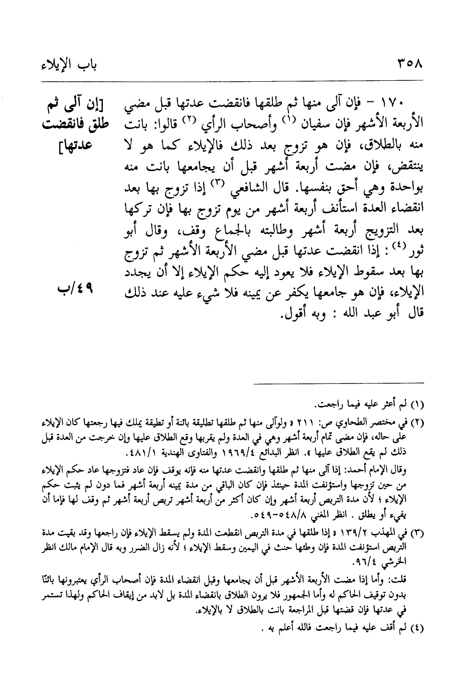 170- فإن آلى منها ثُمَّ طلقها فانقضت عدتها قبل مضي الأربعة الأشهر فإن سُفْيَان وأَصْحَاب الرَّأْيِ قَالُوْا: بانت منه بالطلاق فإن هو تزوج بَعْد ذَلِكَ فالإيلاء كما هو لَا ينتقض فإن مضت أربعة أشهر قبل أن يجامعها بانت منه وهي أحق بنفسها.