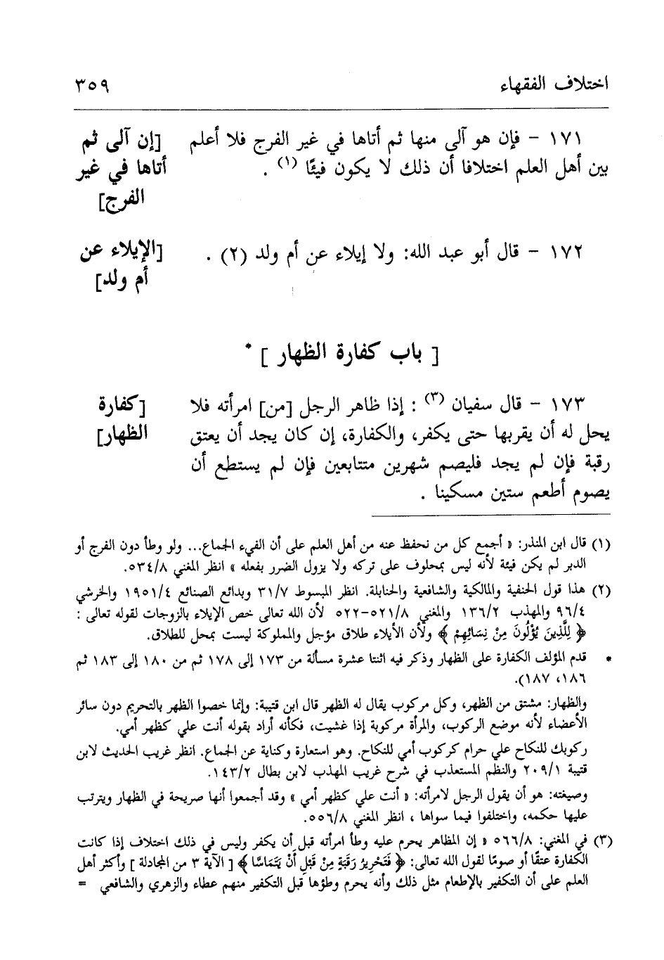 173- قَالَ سُفْيَانُ: إِذَا ظاهر الرَّجُل امرأته فلا يحل له أن يقربها حَتَّى يكفر والكفارة إن كَانَ يجد أن يعتق رقبة فإن لم يجد فليصم شهرين متتابعين فإن لم يستطع أن يصوم أطعم ستين مسكينا.