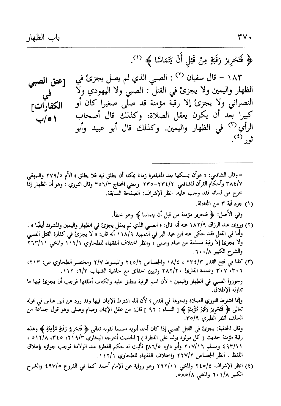 183- قَالَ سُفْيَانُ: الصَّبِيّ الذي لم يصل بجزء فِي الظِّهَار واليمين ولا يجزئ فِي القتل الصَّبِيّ ولا الْيَهُوْدِيّ ولا النَّصْرَانِيّ ولا تجزئ إِلَّا رقبة مؤمنة قد صلى، صغيرا كَانَ أَوْ كبيرا بَعْد أن يكون يعقل الصَّلَاة وكذَلِكَ قَالَ أَصْحَابُ الرَّأْيِ فِي الظِّهَار واليمين.