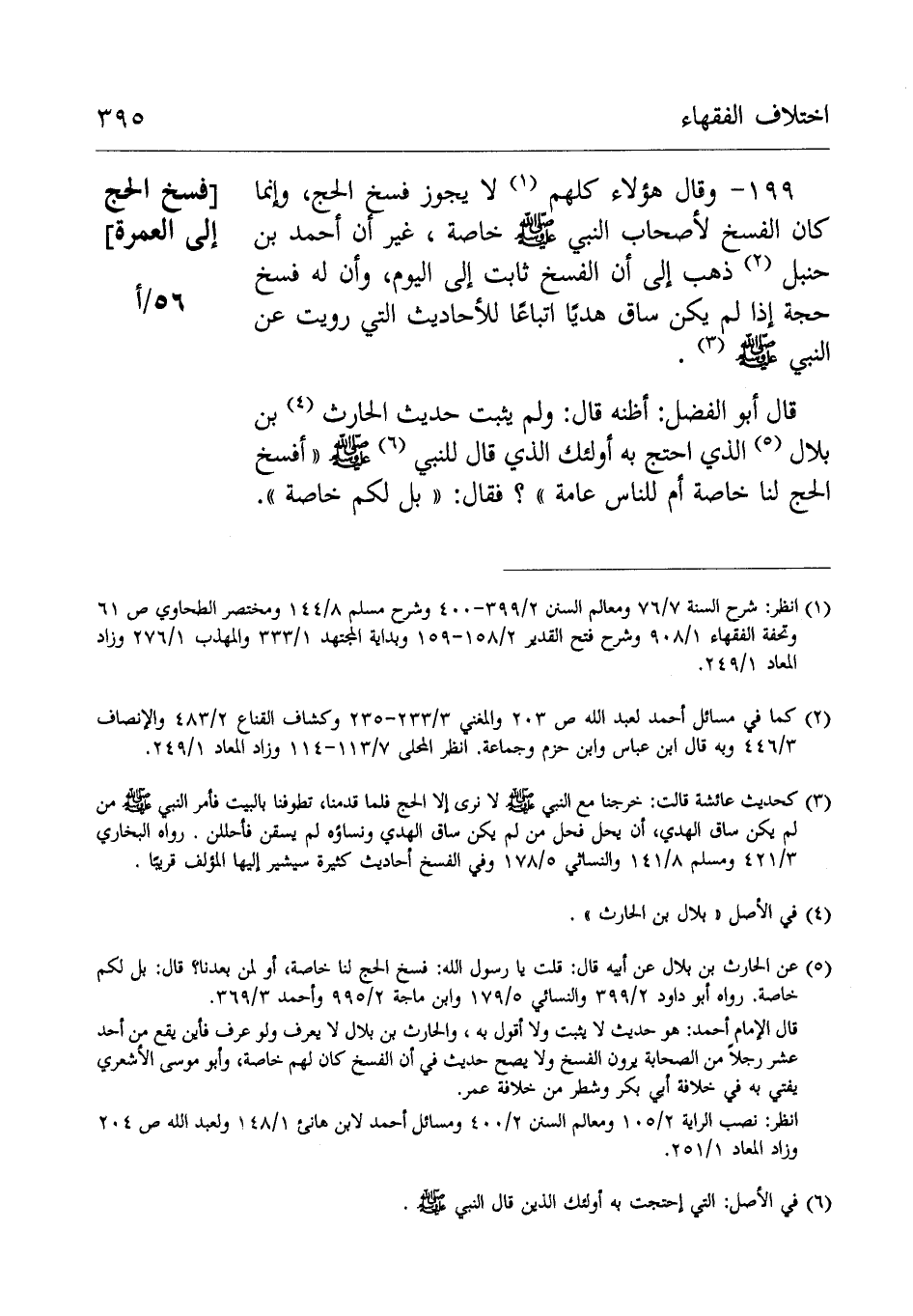 199- وَقَالَ هؤلاء كلهم: لَا يجوز فسخ الحج وإنما كَانَ الفسخ لأَصْحَاب النَّبِيّ صَلَّى اللهُ عَلَيْهِ وَسَلَّمَ خاصةغَيْر أَنَّ أَحْمَدَ بْنَ حَنْبَلٍ ذهب إِلَى أن الفسخ ثابت إِلَى اليوم وأن له فسخ حجه إِذَا لم يكن ساق هديا اتباعا للأحاديث التي رويت عَن النَّبِيّ صَلَّى اللهُ عَلَيْهِ وَسَلَّمَ
