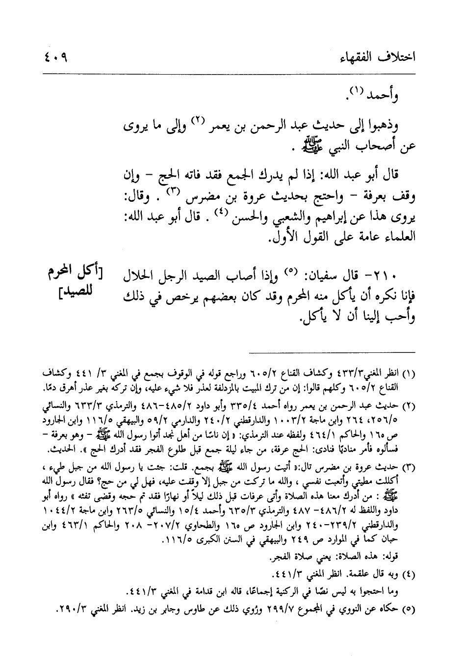 210- قَالَ سُفْيَانُ: وإِذَاأصاب الصيد الرَّجُل الحلال فإنا نكره أن يأكل من المحرم وقد كَانَ بعضهم يرخص فِي ذَلِكَ وَأَحَبُّ إِلَيَّنا أن لَا يأكل