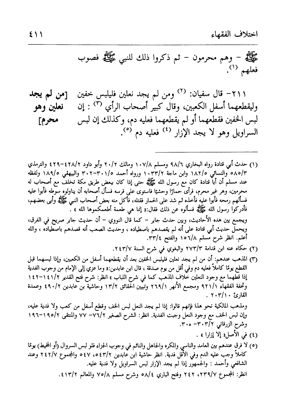 211- قَالَ سُفْيَانُ: ومن لم يجد نعلين فليلبس خفين وليقطعهما أسفل الكعبين.