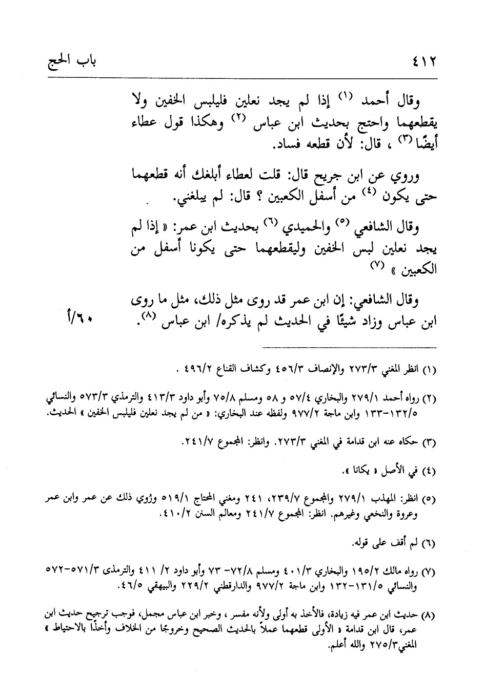وَقَالَ أَحْمَدُ: إِذَا لم يجد النعلين فليلبس الخفين ولا يقطعهما. واحتج بحَدِيْث ابْن عَبَّاس.
