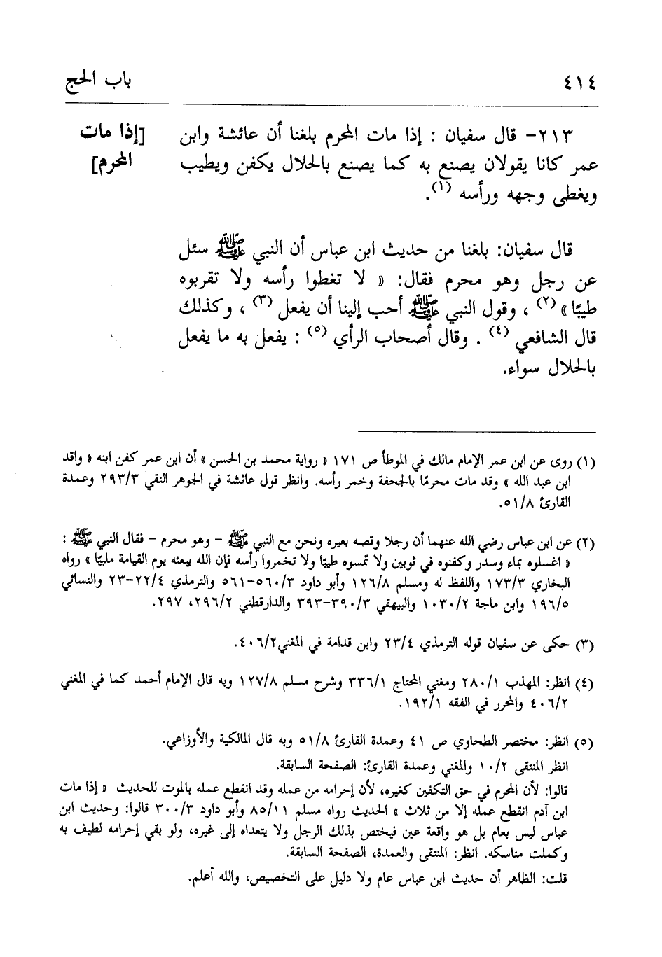 213- وقَالَ سُفْيَانُ: إِذَا مَاتَ المحرم بلغنا أن عَائِشَة وابن عُمَر كانا يقولان: يصنع بِهِ كما يصنع بالحلال يكفن ويطيب ويغطى وجهه ورأسه.