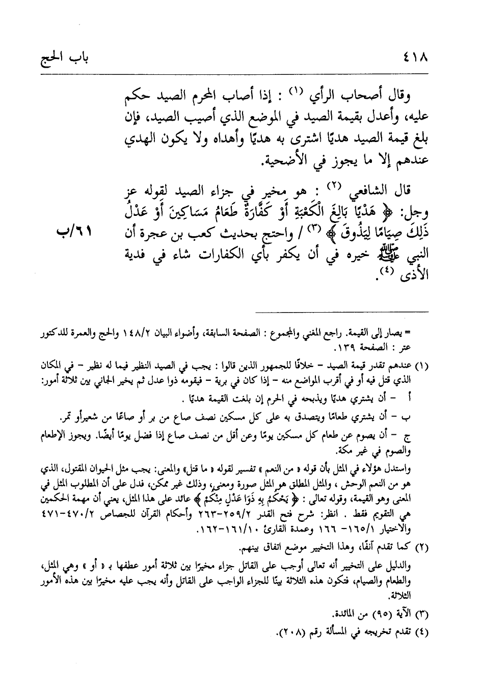 قَالَ الشَّافِعِيُُّ: هو مخير فِي جزاء الصيد لقول الله عز وجل: {هَدْياً بَالِغَ الْكَعْبَةِ أَوْ كَفَّارَةٌ طَعَامُ مَسَاكِينَ أَو عَدْلُ ذَلِكَ صِيَاماً لِّيَذُوقَ وَبَالَ أَمْرِهِ [المائدة: 95} [61/ب] واحتج بحَدِيْث كعب بْن عجرة أَنَّ النَّبِيَّ صلي الله عَلَيْهِ وسلم خيره فِي أن يكفر بأي الكفارات شاء فِي فدية الأذى