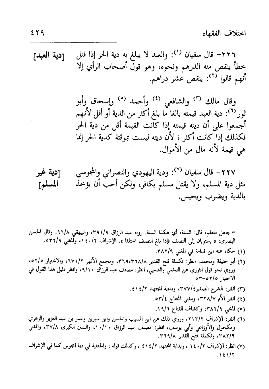 226- قَالَ سُفْيَان: والعبد لايبلغ بِهِ دية الحر إِذَا قتل خطأ ينقص منه الدِّرْهَم ونحوه، وهو قَوْل أصحاب الرَّأْي إِلَّا أَنَّهُم قَالُوْا: ينقص عشرة دراهم.