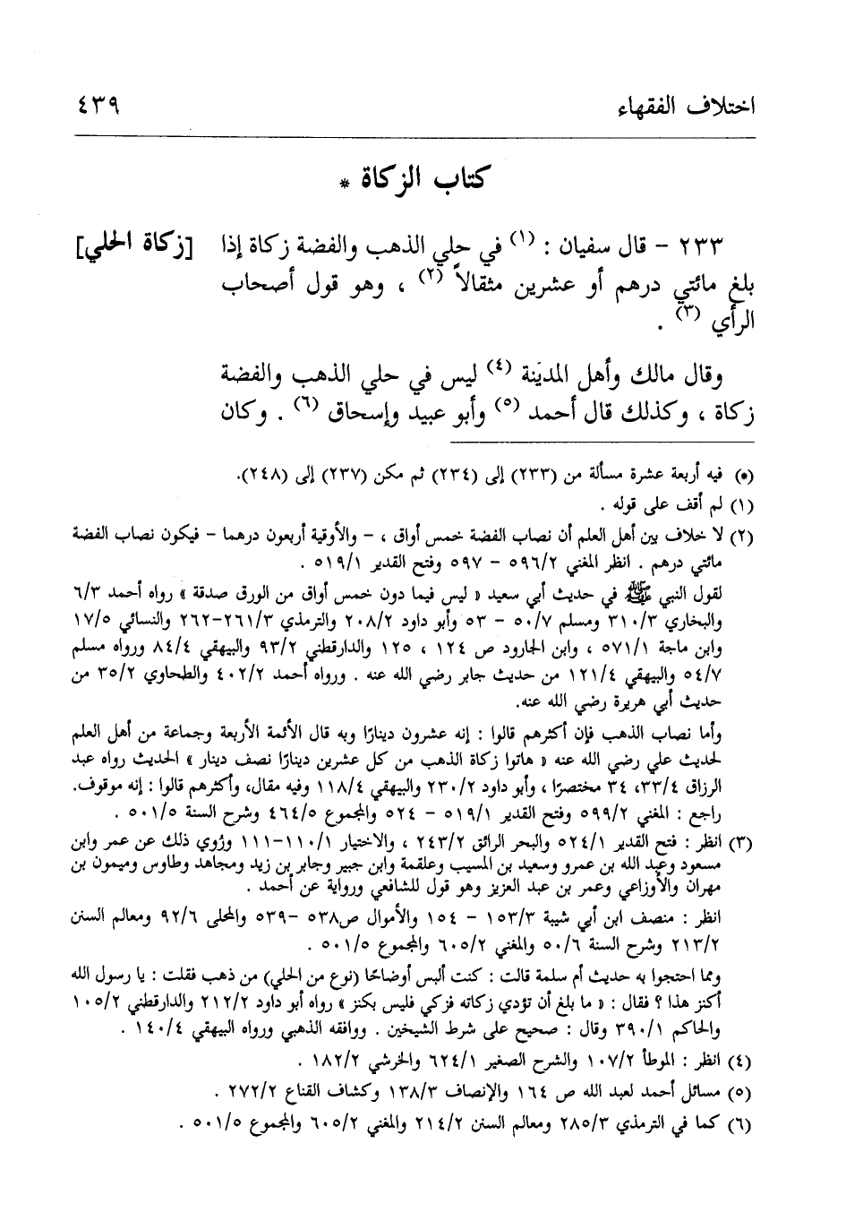 233- قَالَ سُفْيَانُ: فِي حلي الذهب والفضة زكاة إِذَا بلغ مائتي درهم أَوْ عشرين مثقالا.