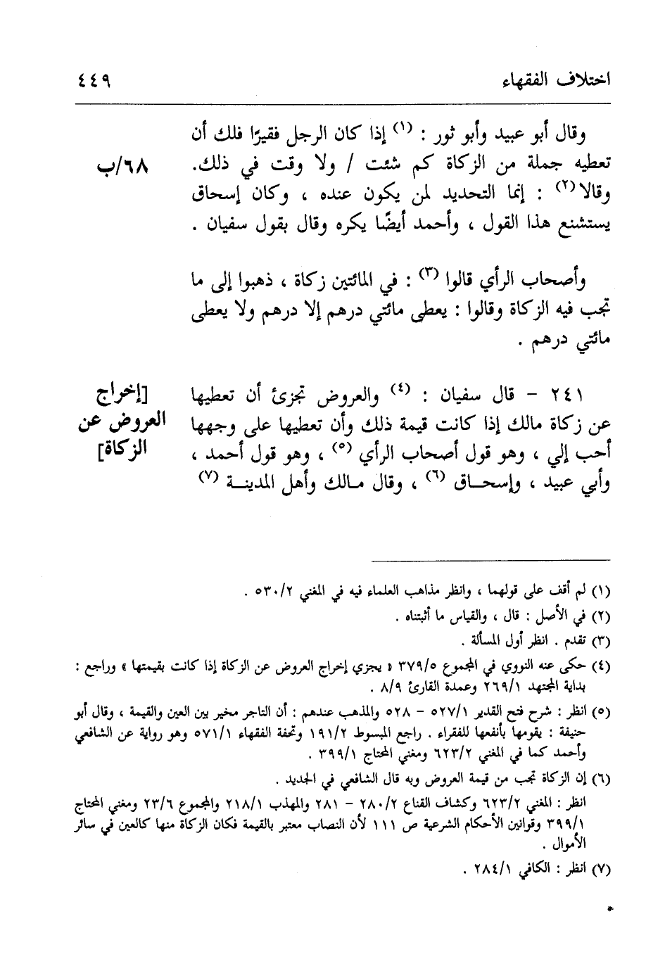 241-وقَالَ سُفْيَانُ: والعروض تجزئ أن تعطيها عَن زكاة مَالك إِذَا كانت قيمته ذَلِكَ، وإن تعطيهاعلى وجهها أحب إلي.