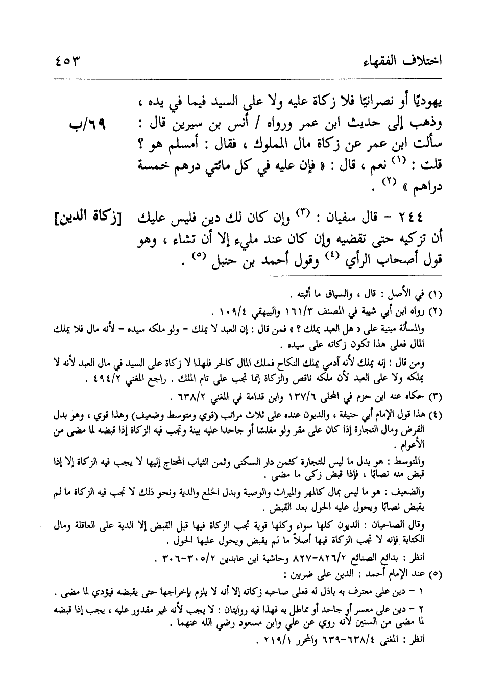 244- قَالَ سُفْيَانُ: وإن كَانَ لك دين فلَيْسَ عَلَيْك أن تزكيه حَتَّى تقبضه وإن كَانَ عِنْدَ مليء إِلَّا أن تشاء.