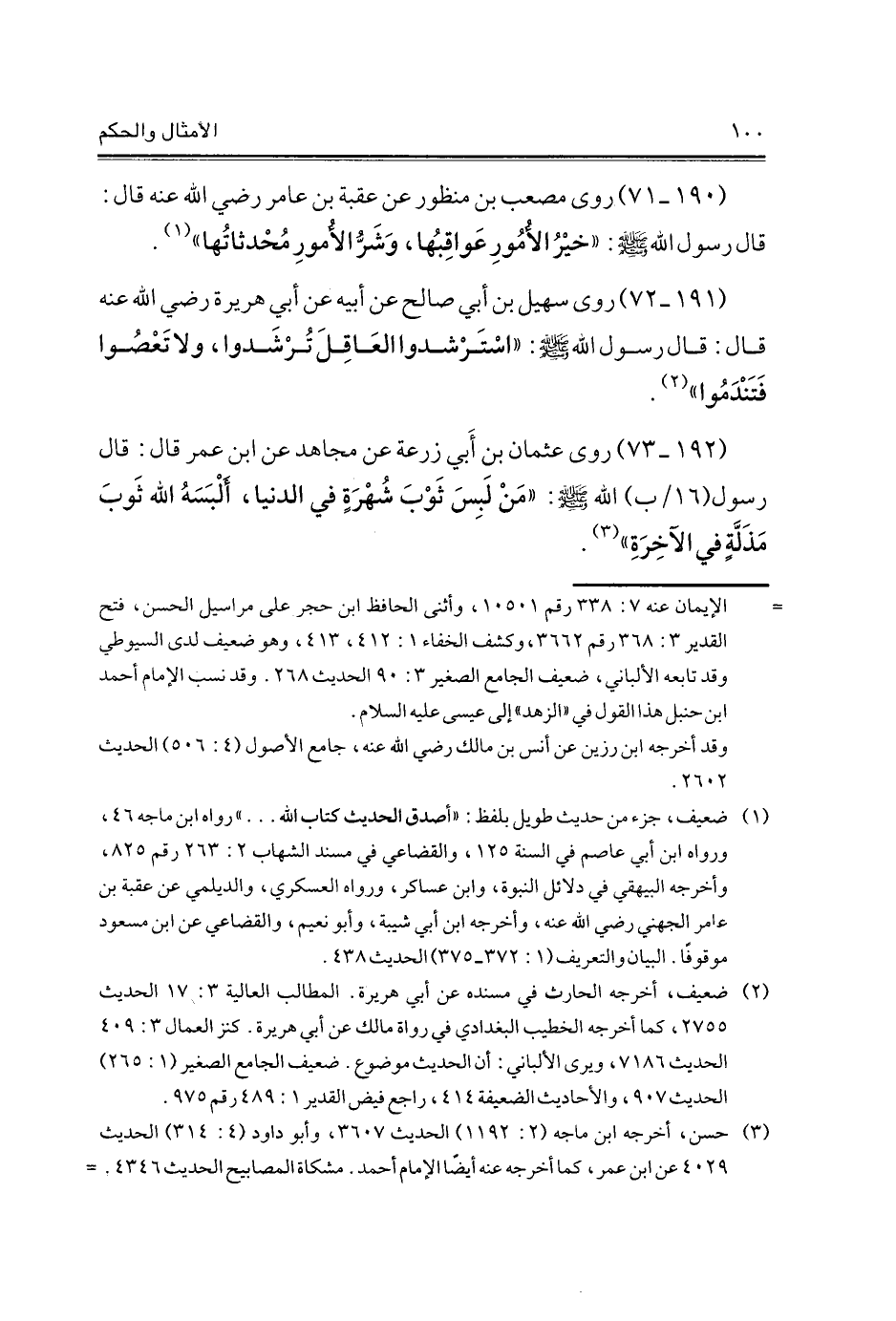 (190 - 71) روى مصعب بن منظور عن عقبة بن عامر - رضي الله عنه - قال: قال رسول الله - صلى الله عليه وسلم -: "خيْرُ الأُمُورِ عَواقِبُها، وَشَرُّ الأُمورِ مُحْدثاتُها" (¬1).