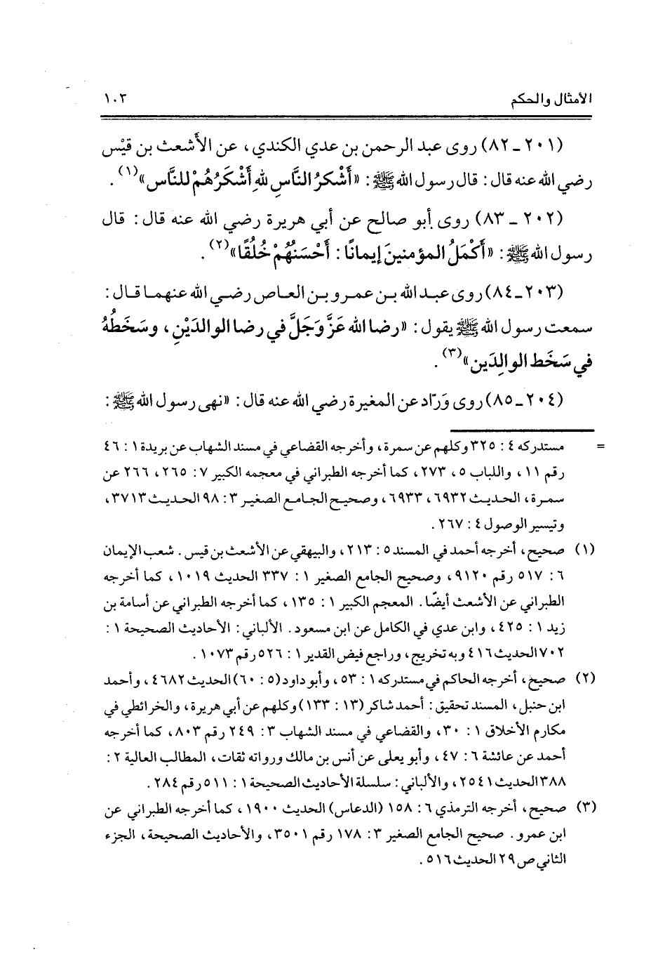 (202 - 83) روى أبو صالح عن أبي هريرة - رضي الله عنه - قال: قال رسول الله - صلى الله عليه وسلم -: "أكْمَلُ المؤمنينَ إيمانًا: أحْسَنُهُمْ خُلُقًا" (¬2).
