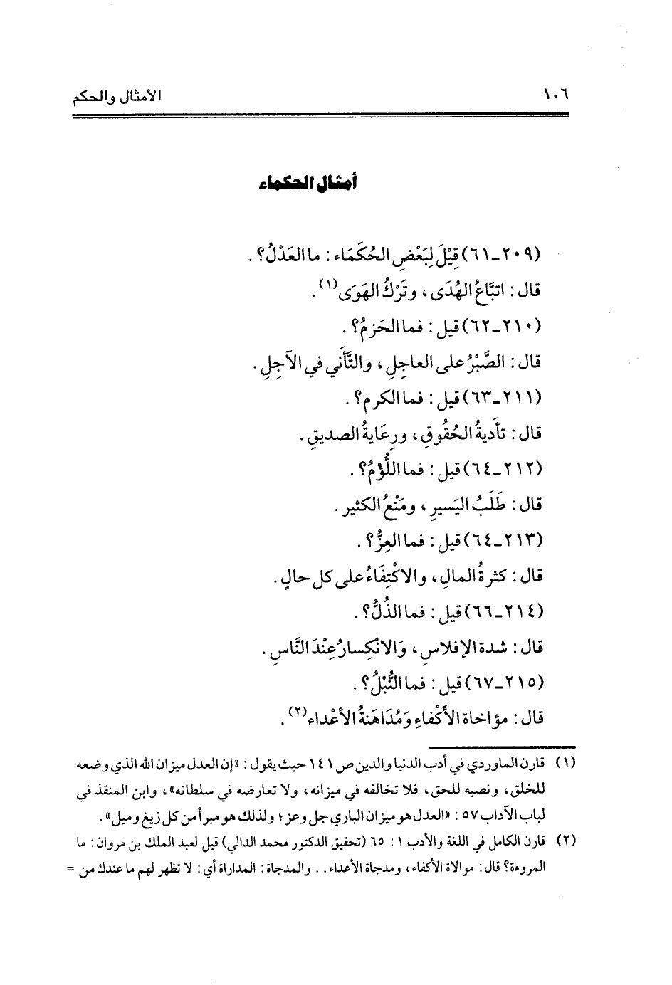 (¬1) قارن الماوردي في أدب الدنيا والدين ص 141 حيث يقول: "إن العدل ميزان الله الذي وضعه للخلق، ونصبه للحق، فلا تخالفه في ميزانه، ولا تعارضه في سلطانه"، وابن المنقذ في لباب الآداب 57: "العدل هو ميزان الباري جل وعز؛ ولذلك هو مبرأ من كل زيغ وميل".