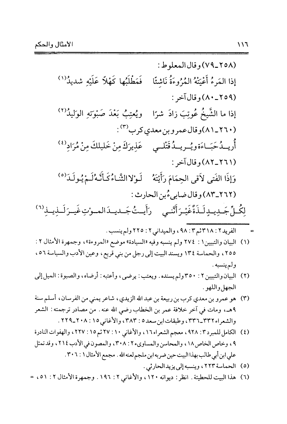 (¬1) البيان والتبيين 1: 274 ولم ينسبه وفيه "السيادة" موضع "المروءة"، وجمهرة الأمثال 2: 255، والحماسة 134 ويسند البيت إلى رجل من بني قريع، وعين الأدب والسياسة 56، ولم ينسبه.