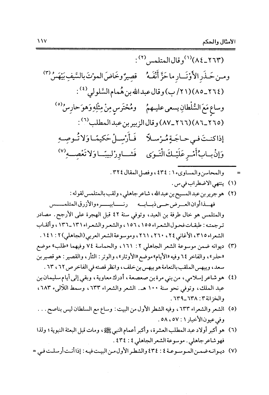 (¬3) ديوانه ضمن موسوعة الشعر الجاهلي 2: 161، والحماسة 74 وفيهما "طلب" موضع "حذر"، والفاخر 64 وفيه "الأيام" موضع "الأوتار"، والوتر: الثأر، والقصير: هو قصير بن سعد، وبيهس الملقب بالنعامة هو بيهس بن خلف، وانظر قصته في الفاخر ص 62، 63.