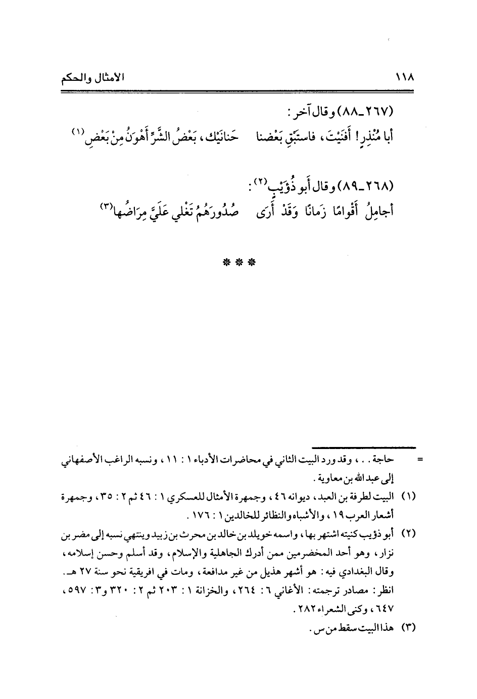 (¬2) أبو ذؤيب كنيته اشتهر بها، واسمه خويلد بن خالد بن محرث بن زبيد وينتهي نسبه إلى مضر بن نزار، وهو أحد المخضرمين ممن أدرك الجاهلية والإِسلام، وقد أسلم وحسن إسلامه، وقال البغدادي فيه: هو أشهر هذيل من غير مدافعة، ومات في افريقية نحو سنة 27 هـ. انظر: مصادر ترجمته: الأغاني 6: 264، والخزانة 1: 203 ثم 2: 320 و 3: 597، 647، وكنى الشعراء 282.