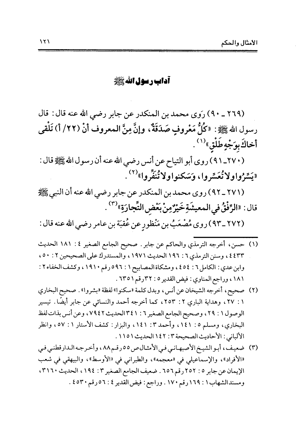 (269 - 90) رَوى محمَّد بن المنكدر عن جابر - رضي الله عنه - قال: قال رسول الله - صلى الله عليه وسلم -: "كُل مَعْروفٍ صَدَقَةٌ، وإن مِنَّ المعروف أنْ تَلْقى أخاكَ بِوَجْهٍ طَلْقٍ" (¬1).