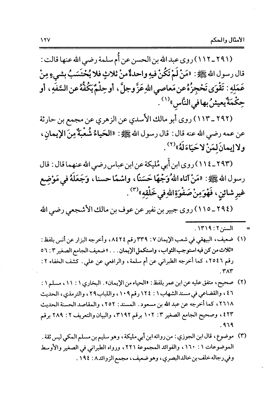 (291 - 112) روى عبد الله بن الحسن عن أُم سلمة -رضي الله عنها- قالت: قال رسول الله - صلى الله عليه وسلم -: "مَنْ لَمْ تكنْ فيهِ واحدةٌ منْ ثلاثٍ فلا يُحْتَسَبُ بشيءٍ مِنْ عَمَلِهِ: تَقْوَى تَحْجِزُهُ عن مَعاصي اللهِ -عَزَّ وجلَّ-، أو حِلْمٌ يكُفُّهُ عن السَّفَهِ، أو حِكْمَةٌ يعيشُ بها في النَّاسِ" (¬1).
