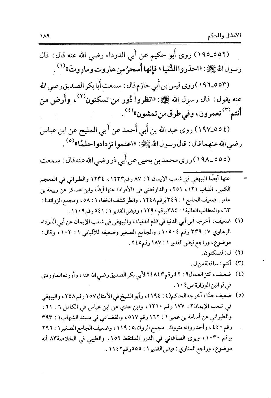 (552 - 195) روى أَبو حكيم عن أَبي الدرداء - رضي الله عنه - قال: قال رسول الله - صلى الله عليه وسلم -: "احذروا الدُنيا؛ فإنها أَسحرُ من هاروت وماروتَ" (¬1).