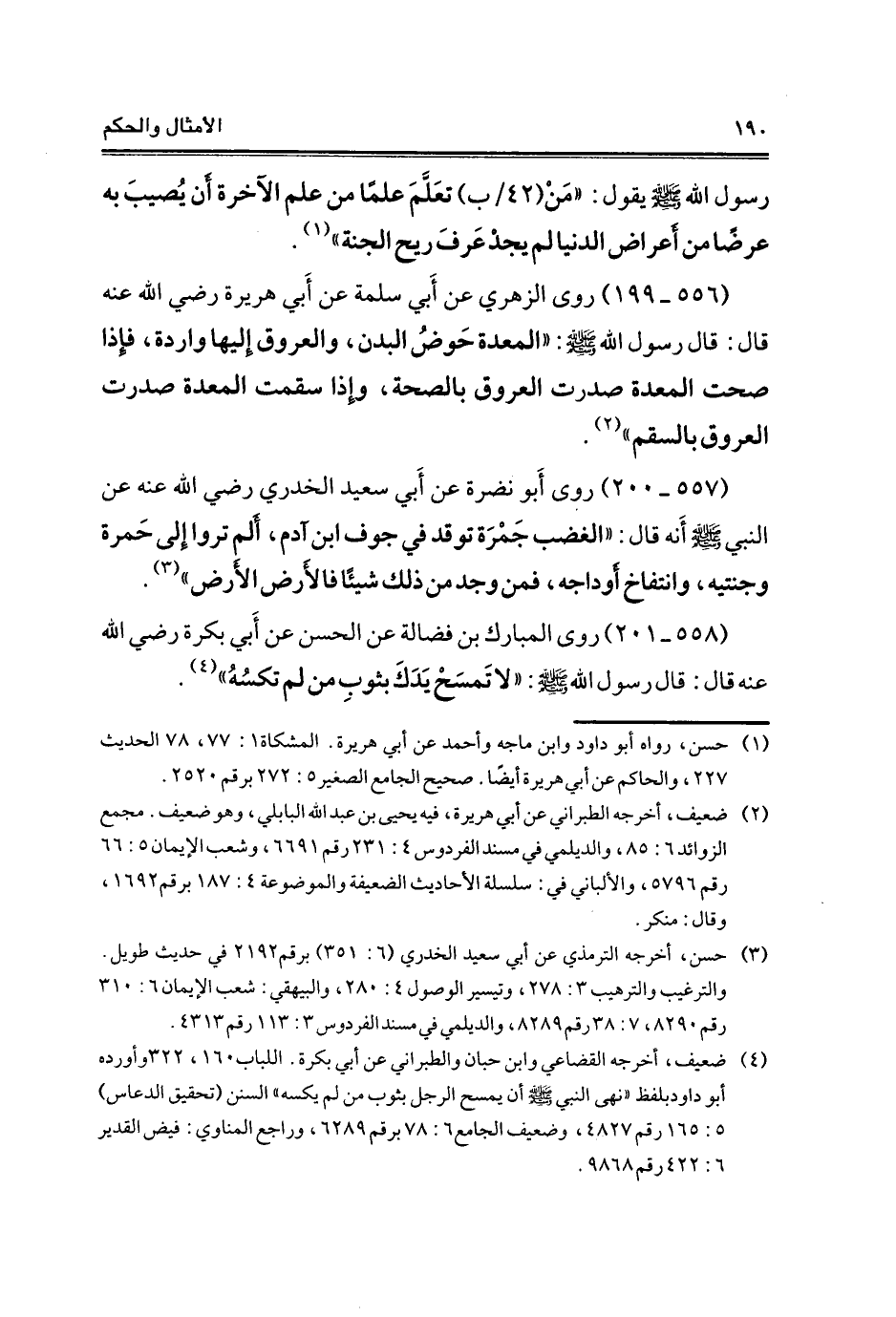 (556 - 199) روى الزهري عن أَبي سلمة عن أَبي هريرة - رضي الله عنه - قال: قال رسول الله - صلى الله عليه وسلم -: "المعدة حَوضُ البدن، والعروق إليها واردة، فإذا صحت المعدة صدرت العروق بالصحة، وإذا سقمت المعدة صدرت العروق بالسقم" (¬2).