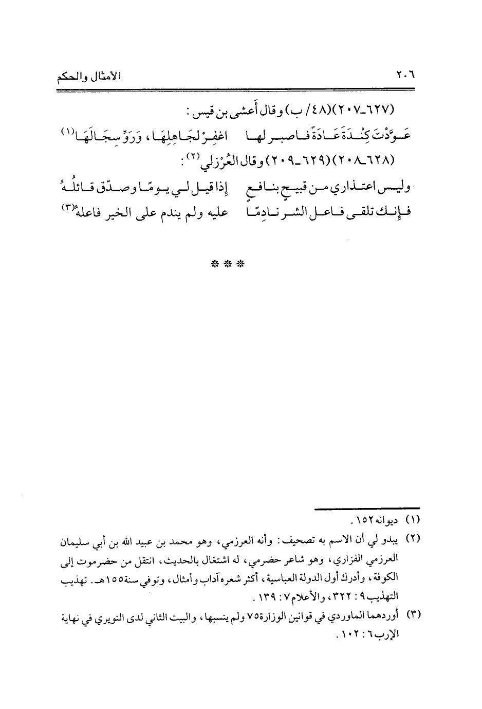 (¬2) يبدو لي أن الاسم به تصحيف: وأنه العرزمي، وهو محمد بن عبيد الله بن أبي سليمان العرزمي الفزاري، وهو شاعر حضرمي، له اشتغال بالحديث، انتقل من حضرموت إلى الكوفة، وأدرك أول الدولة العباسية، أكثر شعره آداب وأمثال، وتوفي سنة 155 هـ. تهذيب التهذيب 9: 322، والأعلام 7: 139.