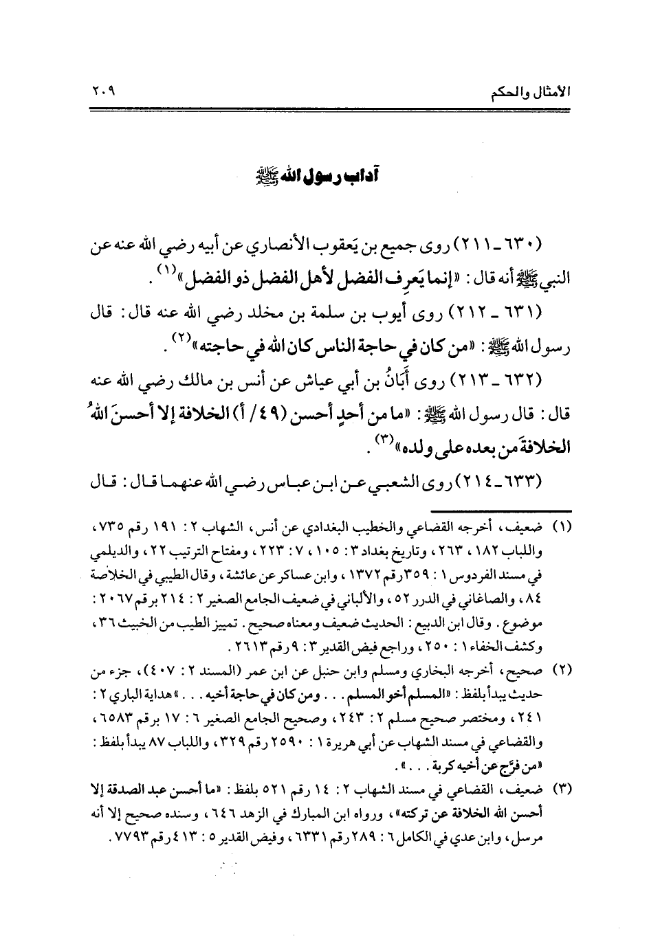 (630 - 211) روى جميع بن يَعقوب الأنصاري عن أبيه - رضي الله عنه - عن النبي - صلى الله عليه وسلم - أنه قال: "إنما يَعرِف الفضل لأهل الفضل ذو الفضل " (¬1).