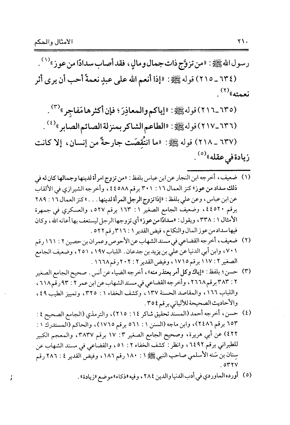 (¬2) ضعيف، أخرجه القضاعي في مسند الشهاب عن الأحوص وعمران بن حصين 2: 161 رقم 701، وابن أبي الدنيا عن علي بن يزيد بن جدعان. اللباب 197، 251، وضعيف الجامع الصغير 2: 117 برقم 1715، وفيض القدير 2: 202 رقم 1668.