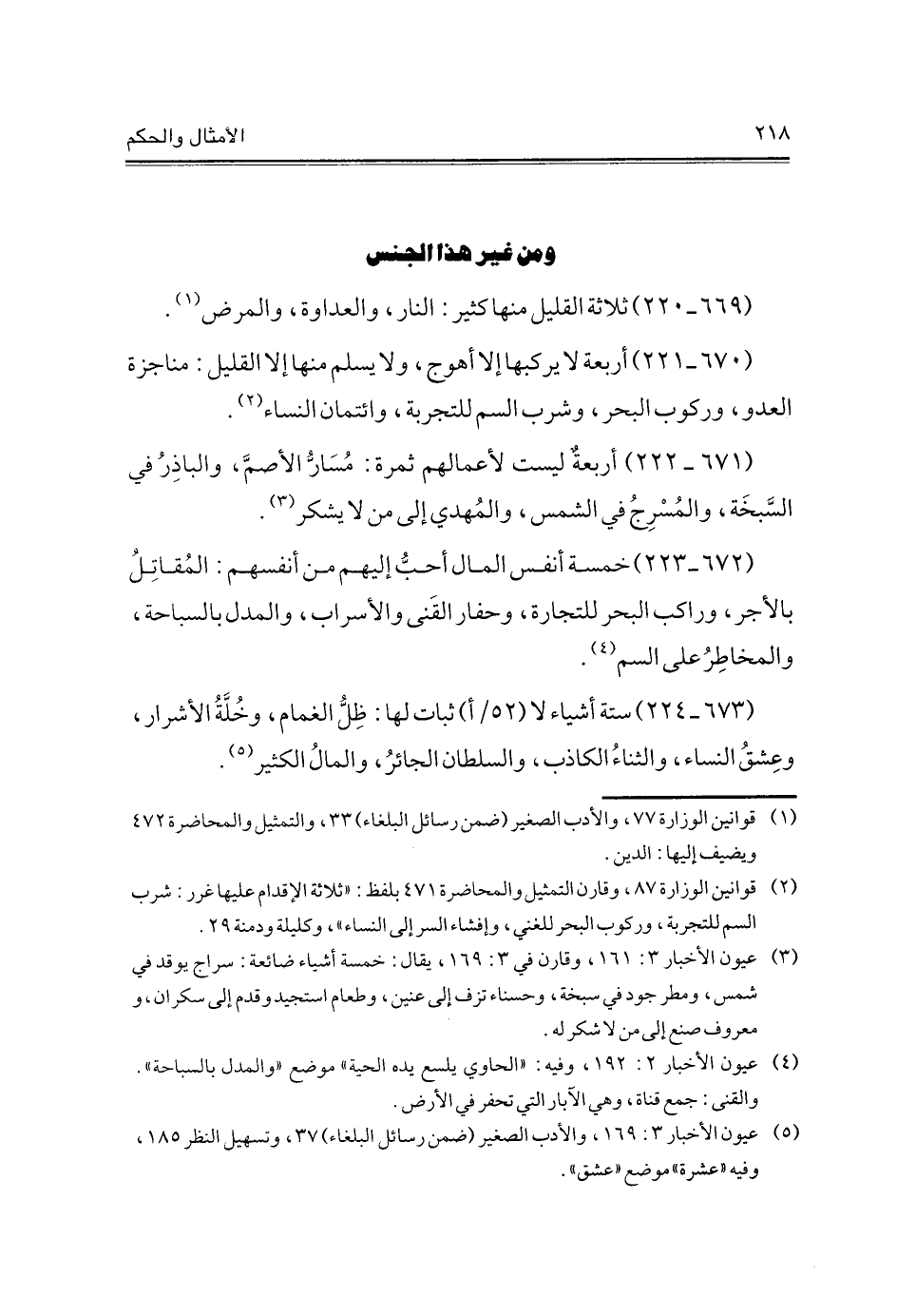 (¬1) قوانين الوزارة 77، والأدب الصغير (ضمن رسائل البلغاء) 33، والتمثيل والمحاضرة 472 ويضيف إليها: الدين.
