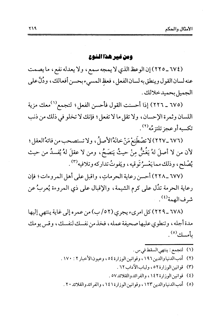 (675 - 226) إذا أحسنت القول فأحسن الفعل؛ لتجمع (¬1) معك مزية اللسان وثمرة الإحسان، ولا تقل ما لا تفعل؛ فإنك لا تخلو في ذلك من ذنب تكسبه أو عجز تلتزمُه (¬2).