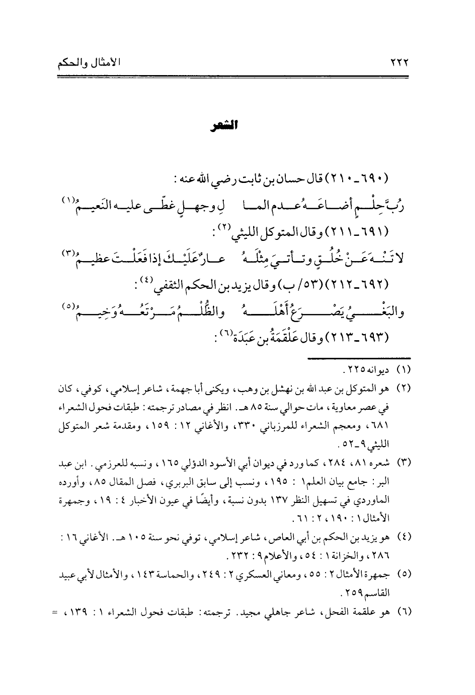 (¬3) شعره 81، 284، كما ورد في ديوان أبي الأسود الدؤلي 165، ونسبه للعرزمي. ابن عبد البر: جامع بيان العلم 1: 195، ونسب إلى سابق البربري، فصل المقال 85، وأورده الماوردي في تسهيل النظر 137 بدون نسبة، وأيضًا في عيون الأخبار 4: 19، وجمهرة الأمثال 1: 190، 2: 61.