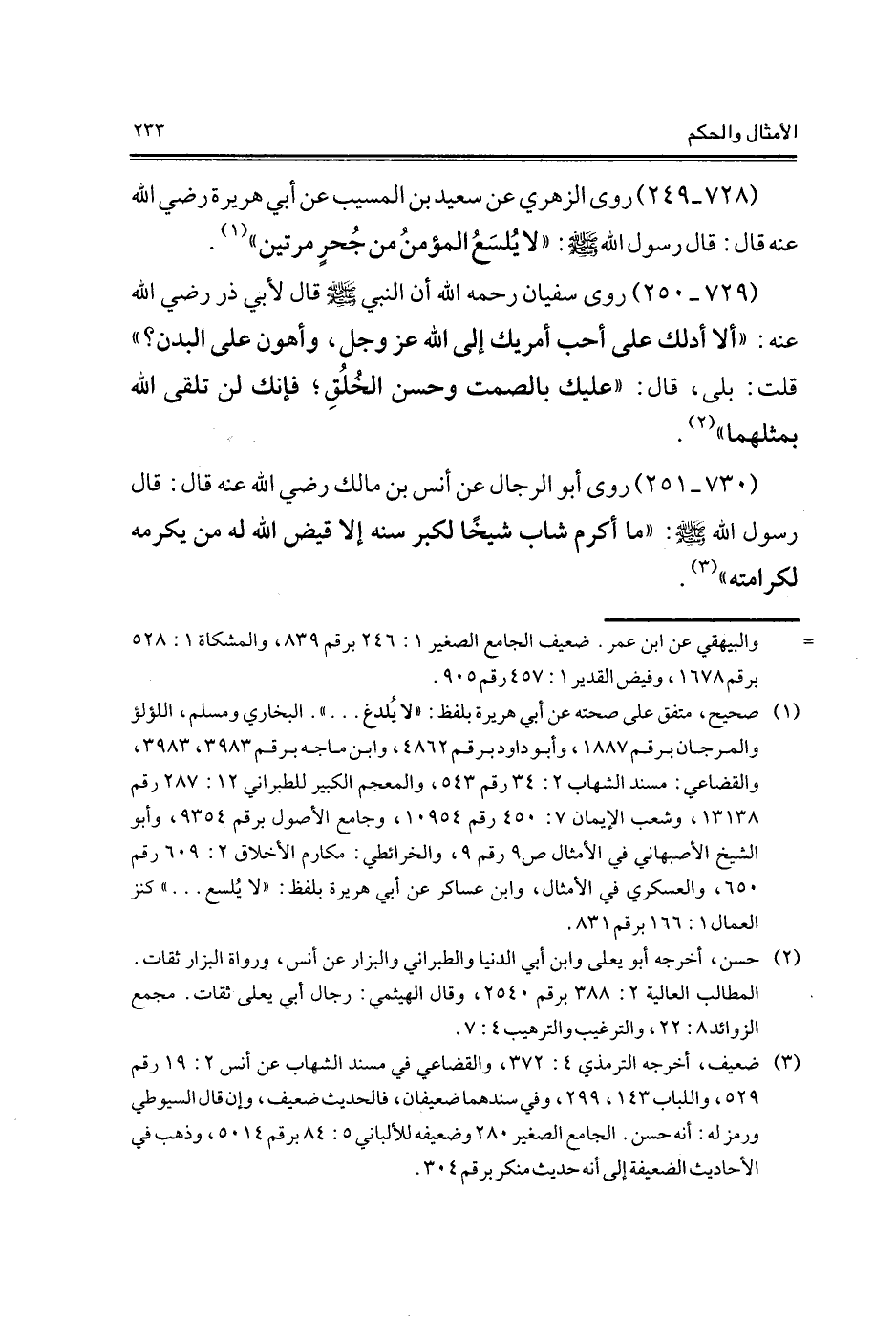 (¬1) صحيح، متفق على صحته عن أبي هريرة بلفظ: "لا يُلدغ. . . .". البخاري ومسلم، اللؤلؤ والمرجان برقم 1887، وأبو داود برقم 4862، وابن ماجه برقم 3983، 3983، والقضاعي: مسند الشهاب 2: 34 رقم 543، والمعجم الكبير للطبراني 12: 287 رقم 13138، وشعب الإيمان 7: 450 رقم 10954، وجامع الأصول برقم 9354، وأبو الشيخ الأصبهاني في الأمثال ص 9 رقم 9، والخرائطي: مكارم الأخلاق 2: 609 رقم 650، والعسكري في الأمثال، وابن عساكر عن أبي هريرة بلفظ: "لا يُلسع. . . ." كنز العمال 1: 166 برقم 831.