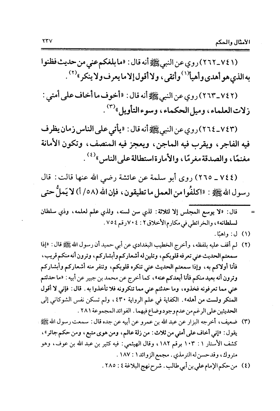 (742 - 263) روي عن النبي - صلى الله عليه وسلم - أنه قال: "أخوف ما أخاف على أمتي: زلات العلماء، وميل الحكماء، وسوء التأويل" (¬3).