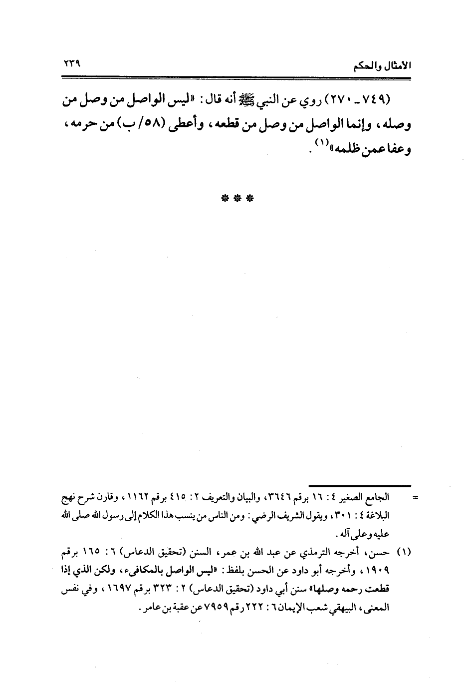 (749 - 270) روي عن النبي - صلى الله عليه وسلم - أنه قال: "ليس الواصل من وصل من وصله، وإنما الواصل من وصل من قطعه، وأعطى من حرمه، وعفا عمن ظلمه" (¬1).