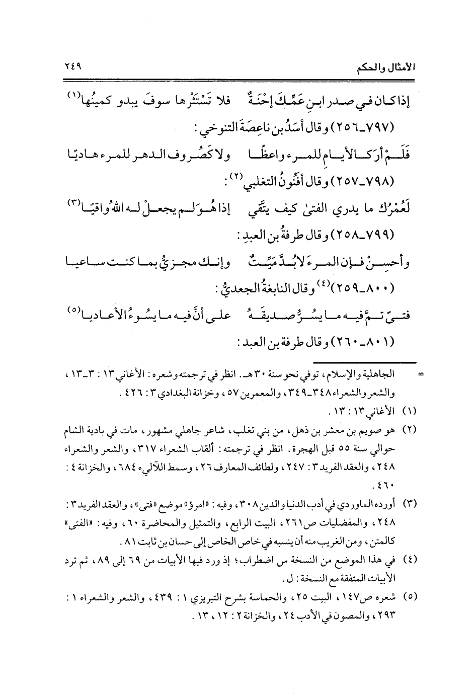 (¬3) أورده الماوردي في أدب الدنيا والدين 308، وفيه: "امرؤ" موضع "فتى"، والعقد الفريد 3: 248، والمفضليات ص 261، البيت الرابع، والتمثيل والمحاضرة 60، وفيه: "الفتى" كالمتن، ومن الغريب منه أن ينسبه في خاص الخاص إلى حسان بن ثابت 81.