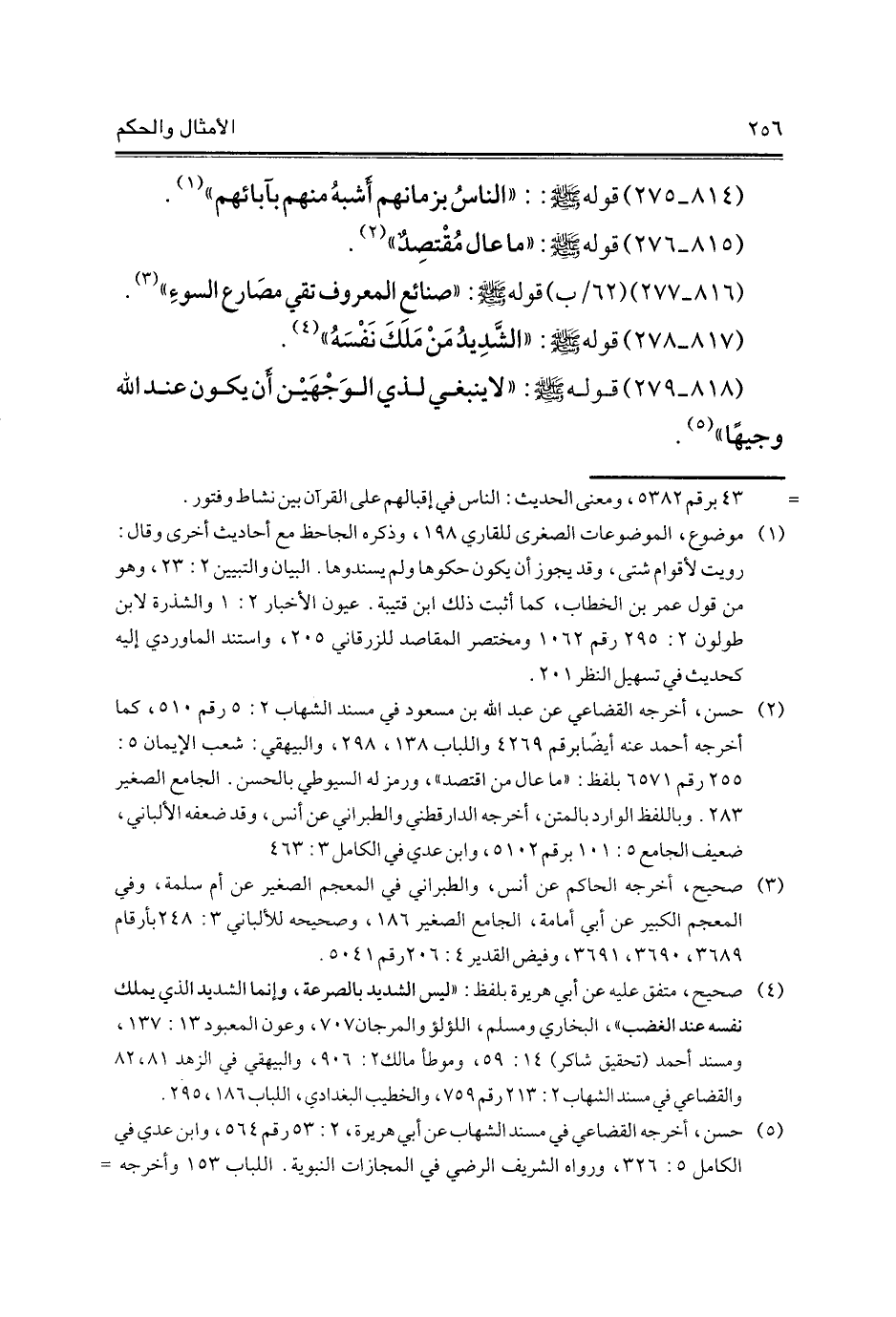 (¬4) صحيح، متفق عليه عن أبي هريرة بلفظ: "ليس الشديد بالصرعة، وإنما الشديد الذي يملك نفسه عند الغضب"، البخاري ومسلم، اللؤلؤ والمرجان 707، وعون المعبود 13: 137، ومسند أحمد (تحقيق شاكر) 14: 59، وموطأ مالك 2: 906، والبيهقي في الزهد 81، 82 والقضاعي في مسند الشهاب 2: 213 رقم 759، والخطيب البغدادي، اللباب 186، 295.