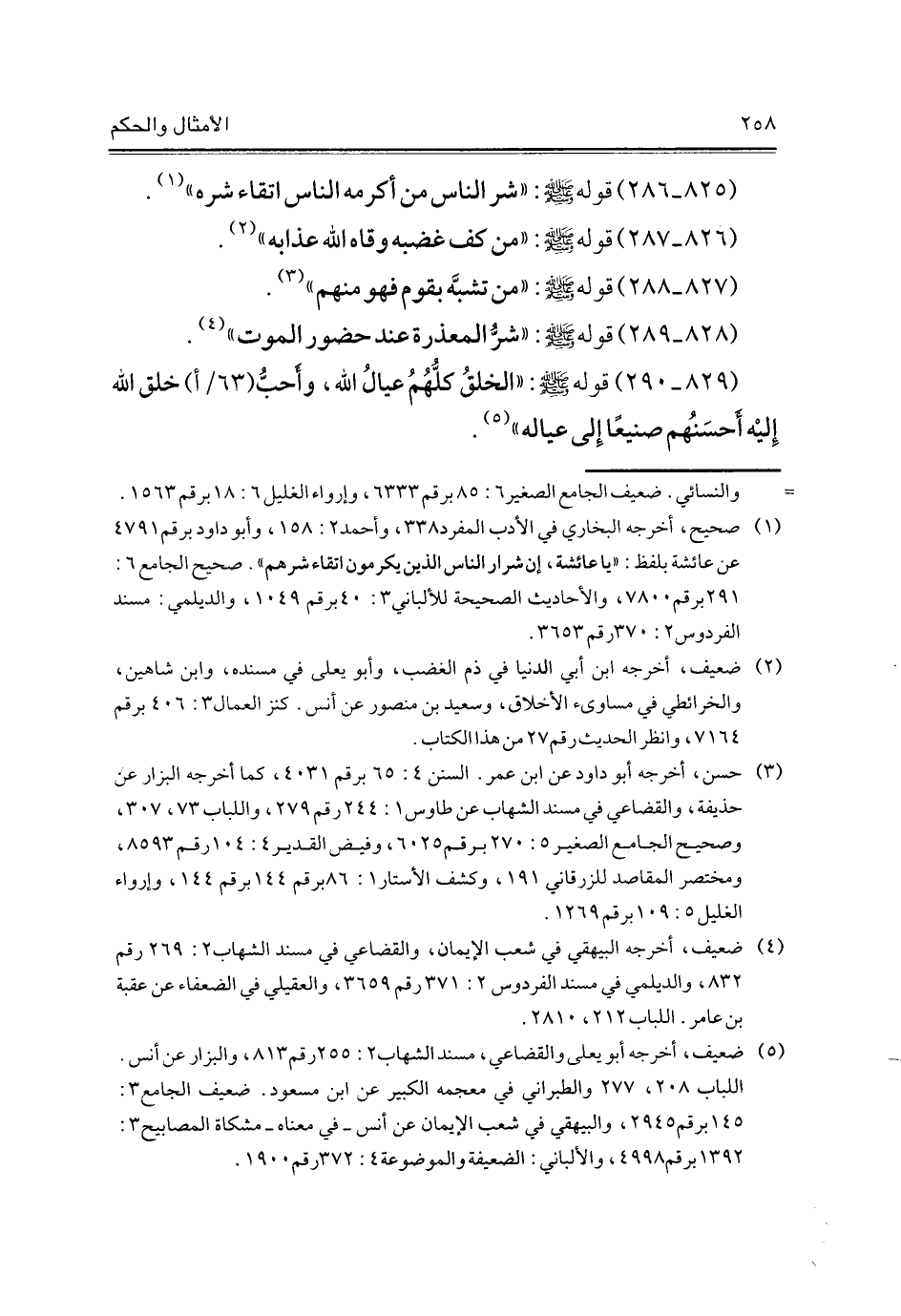 (¬4) ضعيف، أخرجه البيهقي في شعب الإيمان، والقضاعي في مسند الشهاب 2: 269 رقم 832، والديلمي في مسند الفردوس 2: 371 رقم 3659، والعقيلي في الضعفاء عن عقبة بن عامر. اللباب 212، 2810.