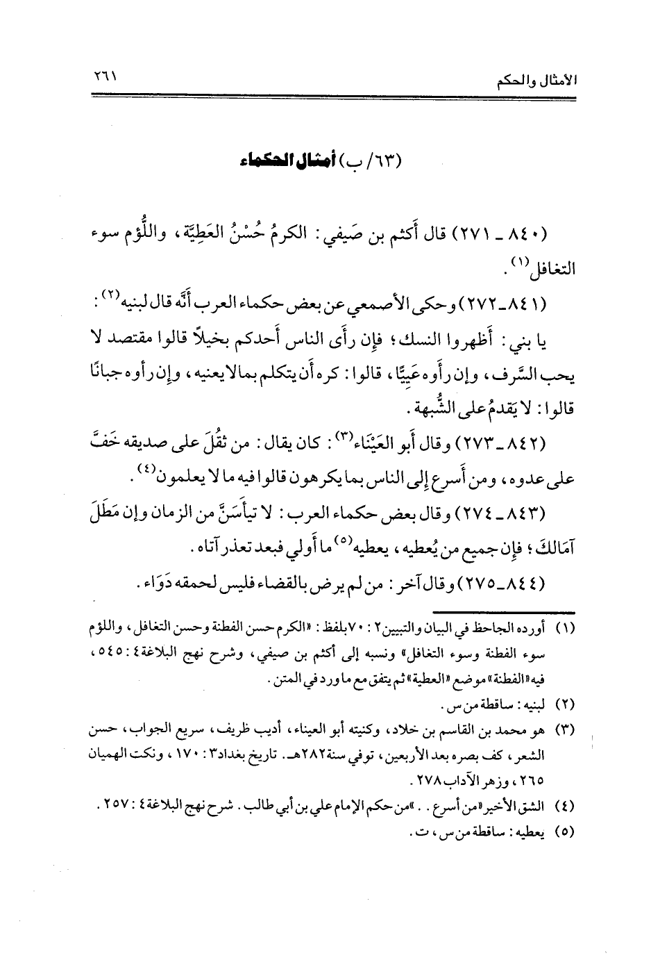 (840 - 271) قال أَكثم بن صَيفي: الكرمُ حُسْنُ العَطِيَّة، واللُّؤم سوء التغافل (¬1).