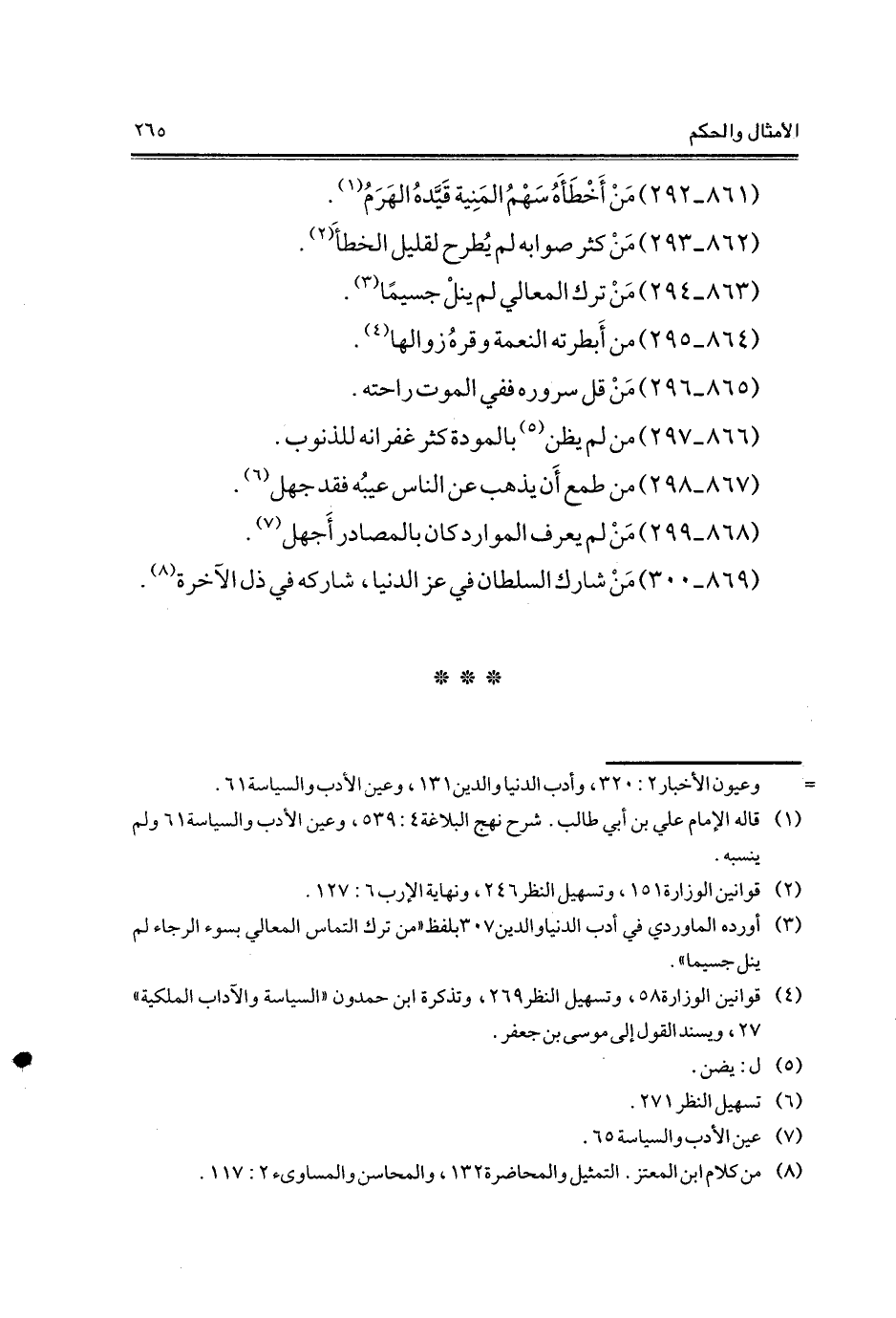 (¬4) قوانين الوزارة 58، وتسهيل النظر 269، وتذكرة ابن حمدون "السياسة والآداب الملكية" 27، ويسند القول إلى موسى بن جعفر.