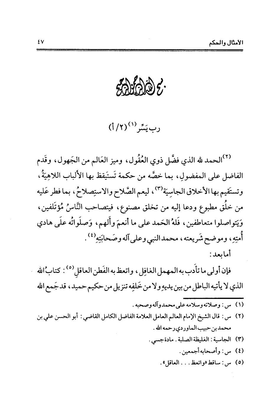 (¬2) الحمد لله الذي فضل ذوي العُقُول، وميز العَالم من الجَهول، وقَدم الفاضل على المفضولِ، بما خصَّه من حكمة تَستَيقظ بها الألباب اللاهِيَةُ، وتستَقيم بها الأخلاق الجاسِيَة (¬3)، ليعم الصلاح والاستِصلاحُ، بما فطر عَليه من خلُق مطبوع ودعا إليه من تخلق مصنوع، فيتصاحب الناسُ مُؤتَلفين، وَيَتواصلوا متعاطفين، فَلهُ الحَمد على ما أنعمَ وأَلهم، وَصلَواتُه علَى هادي أُمتِهِ، وموضح شَريعته، محمد النبي وعلى آله وصَحابَتِهِ (¬4).