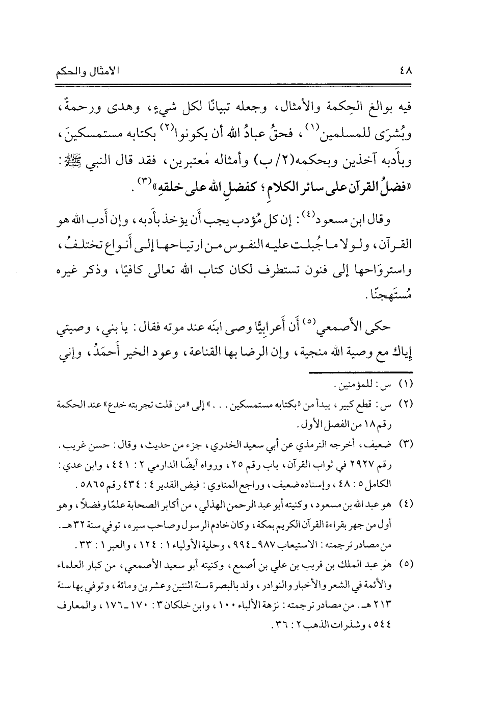 فيه بوالغ الحِكمة والأمثال، وجعله تبيانًا لكل شيءٍ، وهدى ورحمةً، وبُشرَى للمسلمين (¬1)، فحقُ عبادُ الله أن يكونوا (¬2) بكتابه مستمسكينَ، وبأَدبه آخذين وبحكمه وأمثاله معتبرين، فقد قال النبي - صلى الله عليه وسلم -: "فضلُ القرآن على سائر الكلامِ؛ كفضلِ الله على خلقهِ" (¬3).