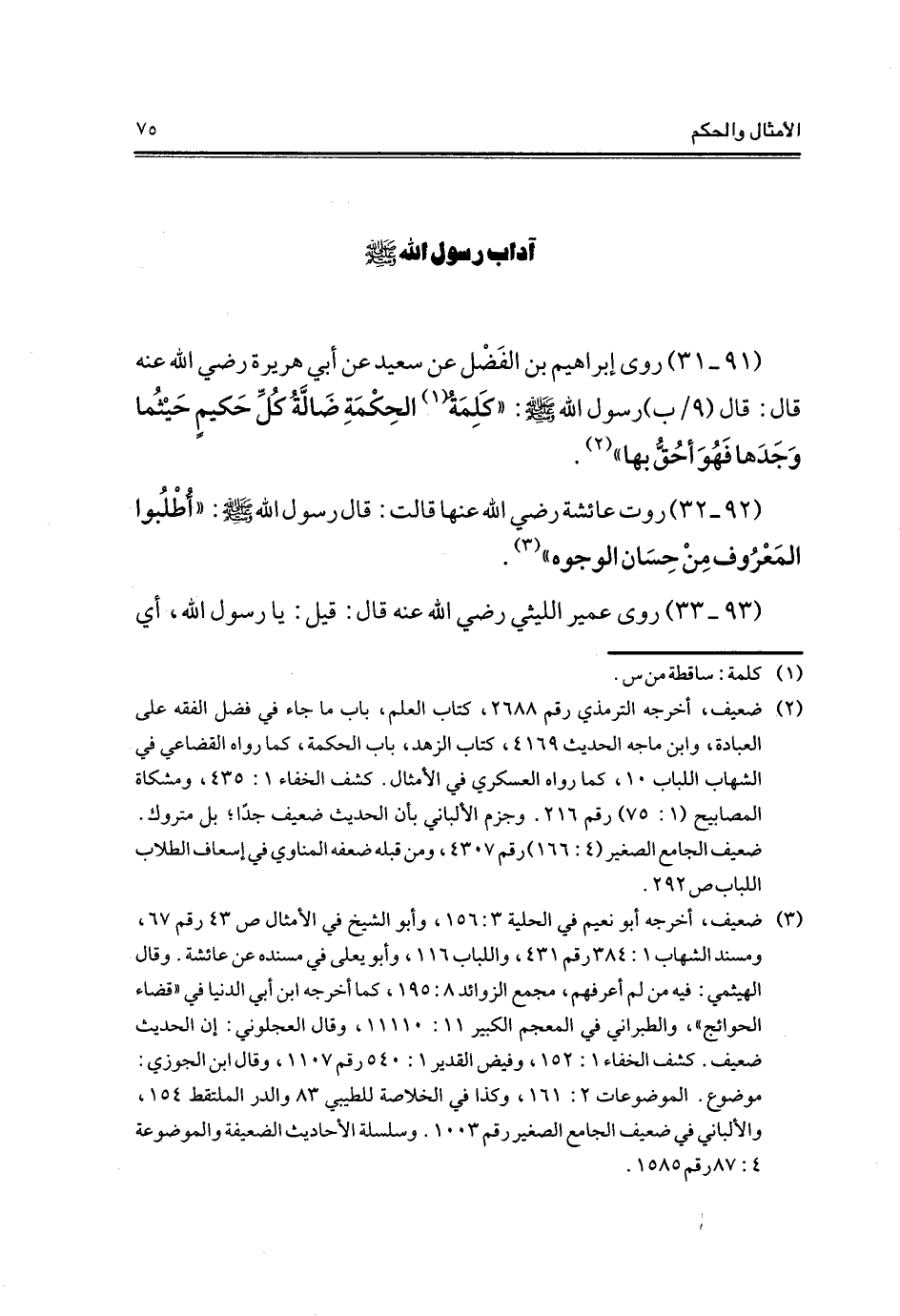 (91 - 31) روى إبراهيم بن الفَضْل عن سعيد عن أبي هريرة - رضي الله عنه - قال: قال رسول الله - صلى الله عليه وسلم -: "كَلِمَةُ (¬1) الحِكْمَةِ ضَالَّةُ كُلِّ حَكيمٍ حَيْثُما وَجَدَها فَهُوَ أحُقُّ بها" (¬2).