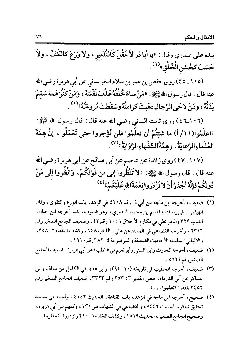 (105 - 45) روى حفص بن عمر بن سلام الخراساني عن أبي هريرة - رضي الله عنه - قال: قال رسول الله - صلى الله عليه وسلم -: "مَنْ ساءَ خُلُقُهُ عَذَّبَ نَفْسَهُ، وَمَنْ كَثُرَ هَمهُ سَقِمَ بَدَنُهُ، ومَنْ لاحَى الرِّجال ذهَبتْ كرامتُهُ وسَقَطتْ مُروءَتُهُ" (¬2).