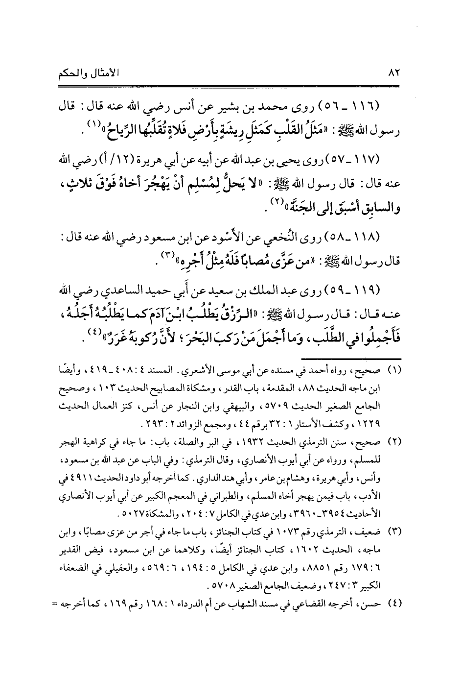 (116 - 56) روى محمد بن بشير عن أنس - رضي الله عنه - قال: قال رسول الله - صلى الله عليه وسلم -: "مَثَلُ القَلْبِ كَمَثَلِ رِيشَةٍ بِأَرْضِ فَلاةٍ تُقَلِّبُها الرِّياحُ" (¬1).
