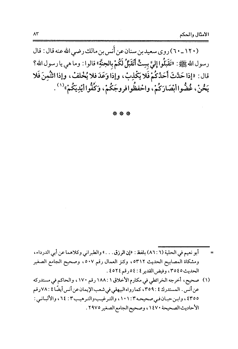 (120 - 60) روى سعيد بن سنان عن أَنس بن مالك - رضي الله عنه - قال: قال رسول الله - صلى الله عليه وسلم -: "تَقَبلُوا إِليَّ بِسِتٍّ أَتَقَبَّلُ لَكُمْ بِالجنَّةِ" قالوا: وما هي يا رسول الله؟ قال: "إذا حَدَّثَ أحَدُكُمْ فَلا يَكْذِبْ، وإذا وَعَدَ فلا يُخْلفْ، وإذا ائْتُمِنَ فَلا يَخُنْ، غُضُّوا أبْصَارَكُمْ، واحْفظُوا فروجَكُمْ، وَكُفُّوا أيْدِيَكُمْ" (¬1).
